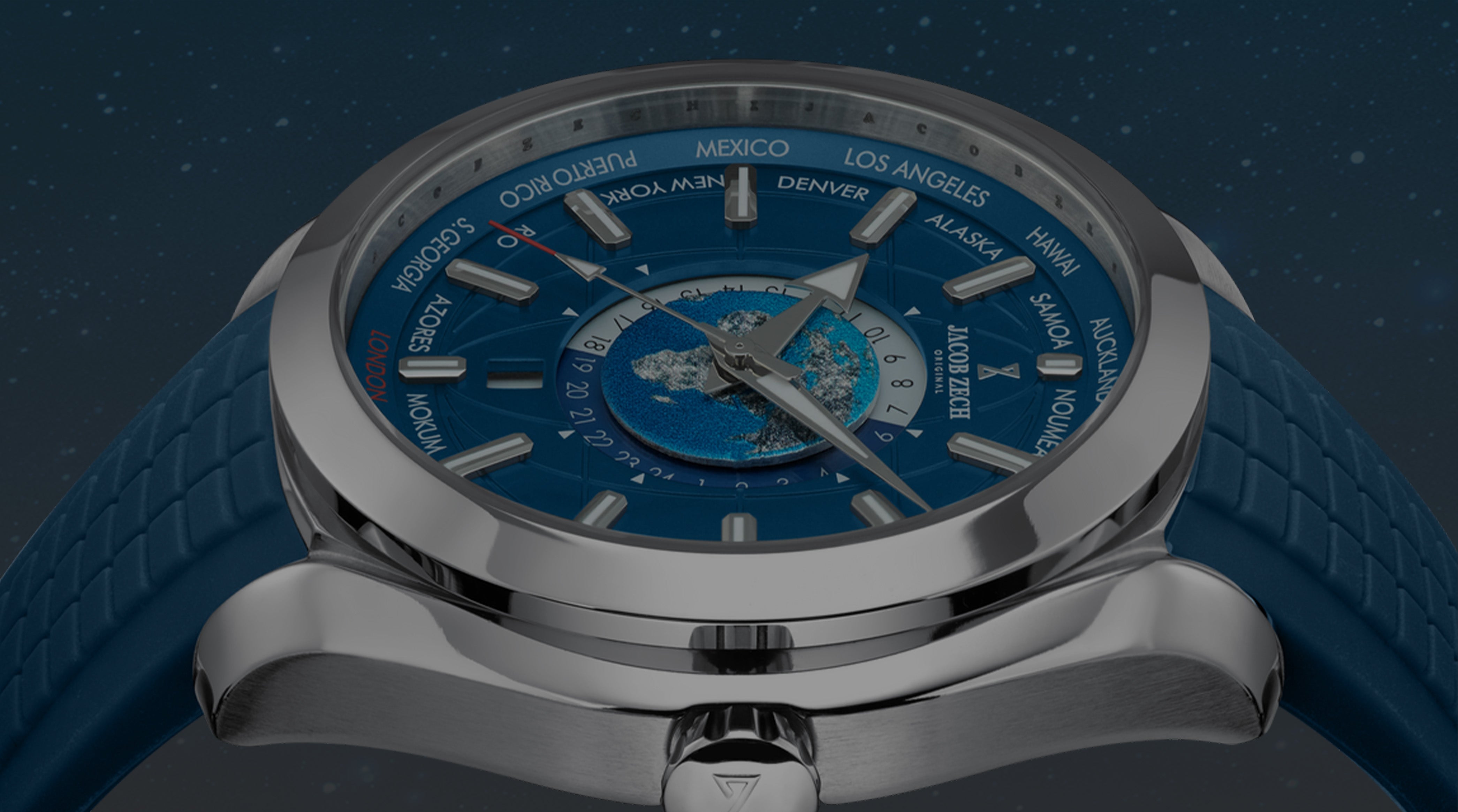 The London Series features world timer watches designed for tracking multiple time zones, combining a classic layout with a refined and well-balanced design.