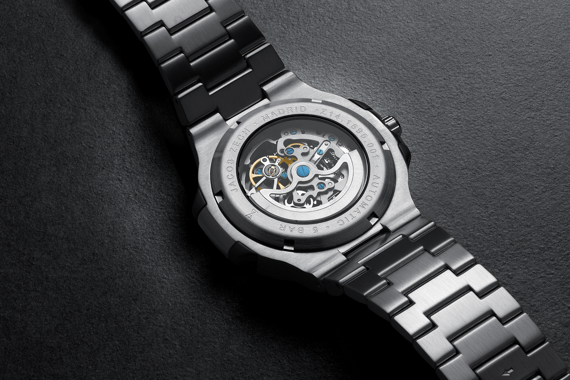 Case: Stainless steel case, 42 mm in diameter and 12.1 mm thick, water resistant up to 5 ATM. The vertically brushed finish gives the watch a refined and modern look.