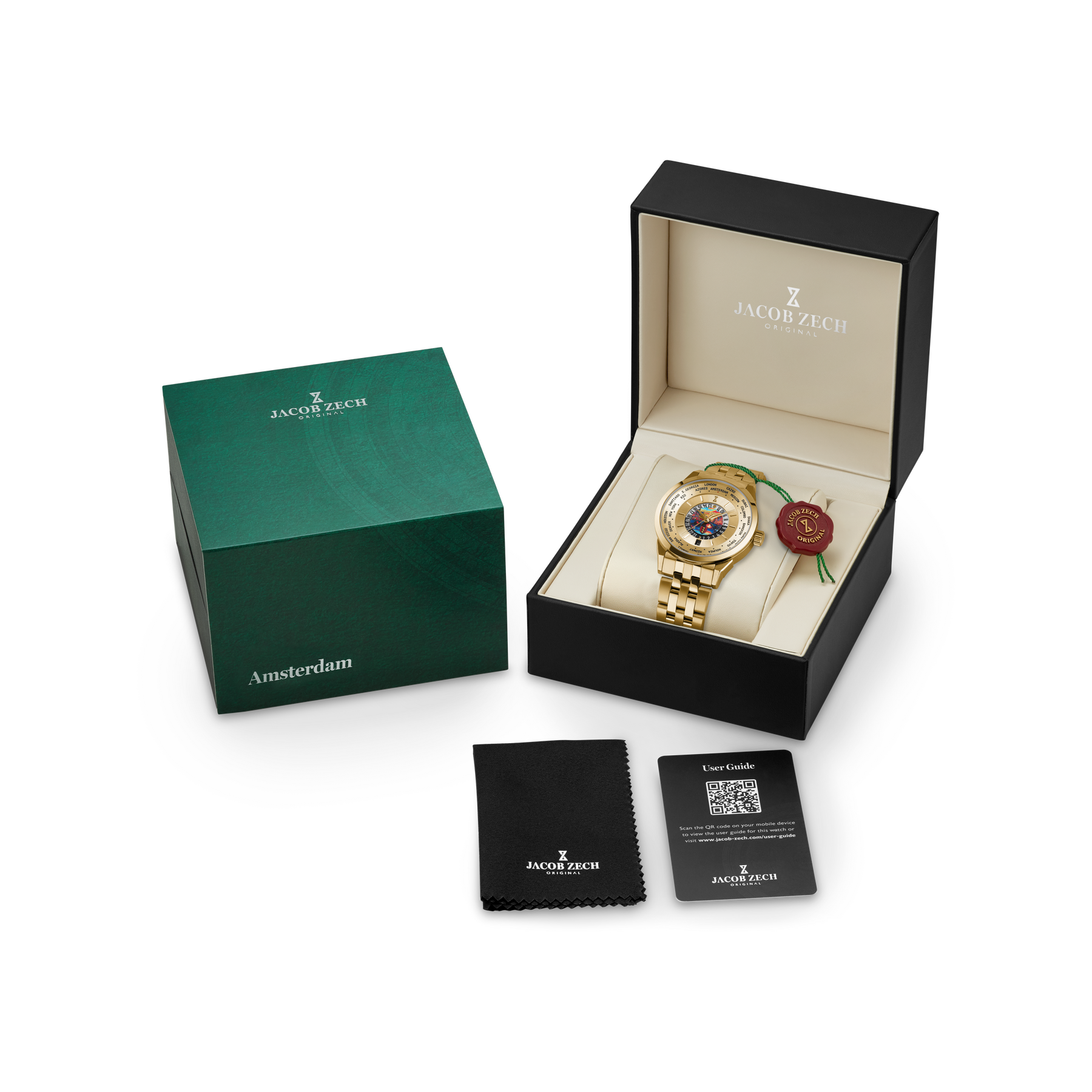 Dial: Gold-tone dial with world time display and a custom Amsterdam city image in the center.